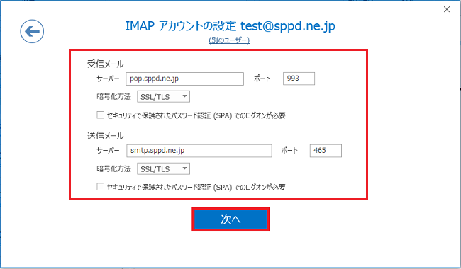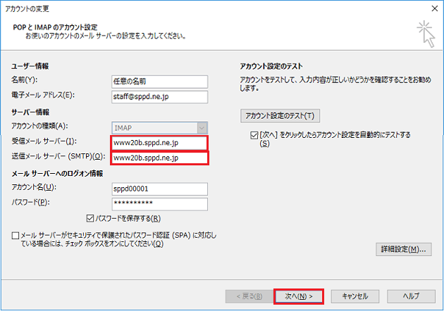 「POPとIMAPのアカウント設定」の画面に戻りますので、「次へ」をクリックします。