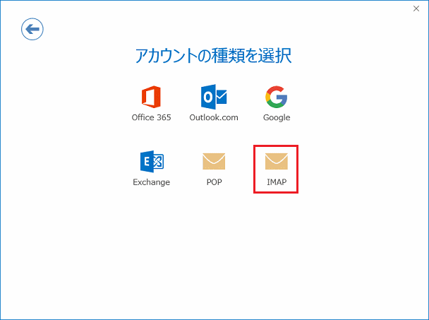 アカウントの種類を選択する画面が表示されるので、「IMAP」をクリックします。