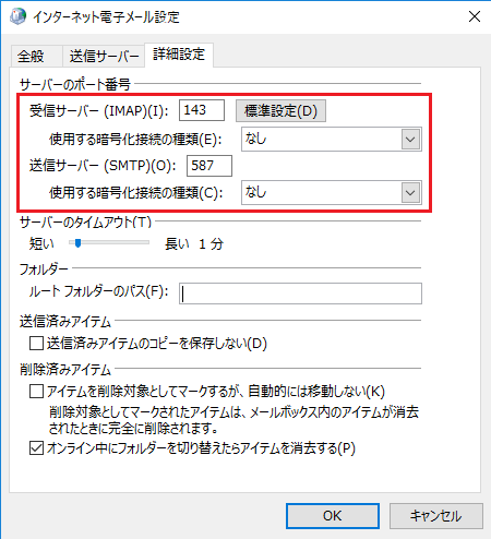 「詳細設定」のタブをクリック後、「受信サーバー(IMAP)」を「993」→「143」に変更し、「使用する暗号化接続の種類」を「なし」に変更します。また、「送信サーバー(SMTP)」を「465」→「587」に変更し、「使用する暗号化接続の種類」を「なし」に変更します。入力が終わりましたら「OK」をクリックします。