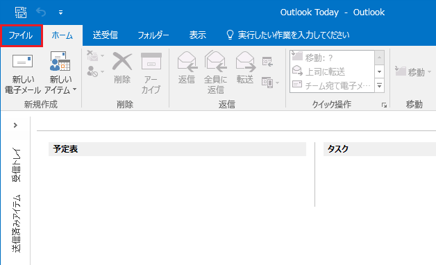 Outlook2019 を起動し、メニューから「ファイル」をクリックします。
