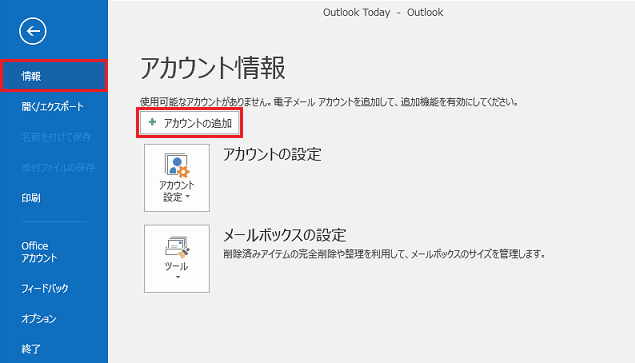 その後、左メニュー「情報」をクリックし、右側に表示されるアカント情報画面上の「アカウントの追加」をクリックします。