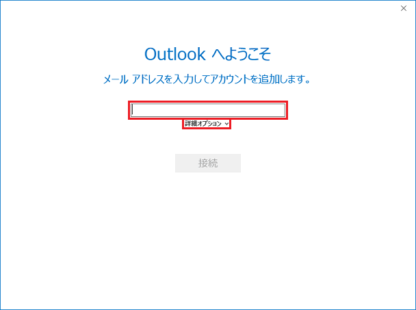 [Outlookへようこそ]という画面が表示されるので、設定するメールアドレスを入力し、「詳細オプション」をクリックします。