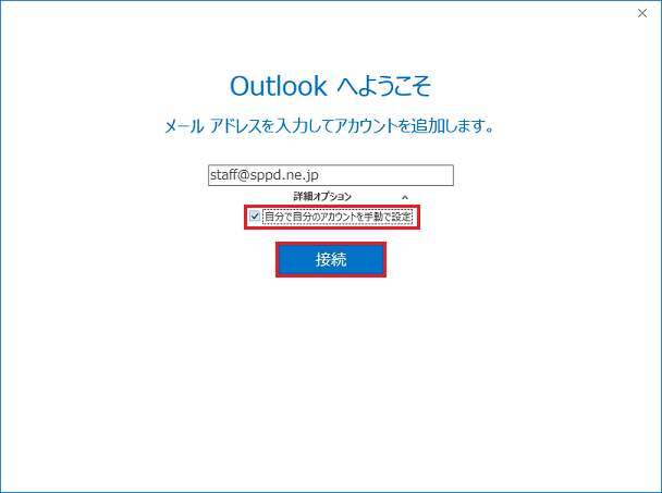 その後、「自分で自分のアカウントを手動で設定」にチェックを入れて、「接続」をクリックします。