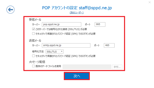 [POPアカウントの設定]画面が表示されるので、以下を参考に各項目を入力し、「次へ」をクリックします。