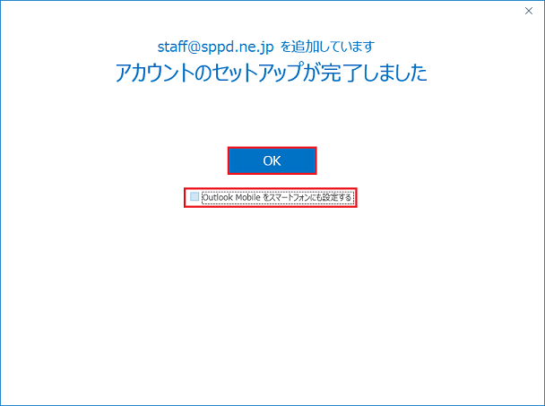 サーバーに正常に接続ができた場合は、[アカウントのセットアップが完了しました]と表示されますので、「Outlook Mobileをスマートフォンにも設定する」はチェックを外して、「OK」をクリックします。以上でアカウントの設定は完了です。