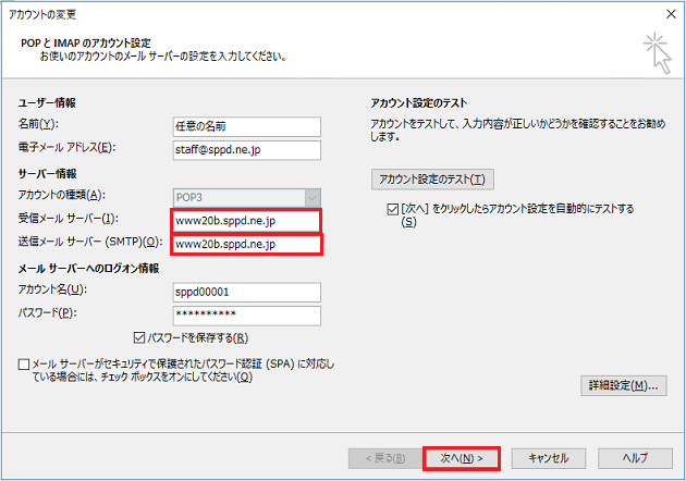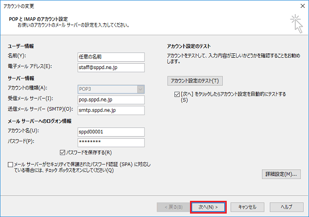 「POPとIMAPのアカウント設定」の画面に戻りますので、「次へ」をクリックします。