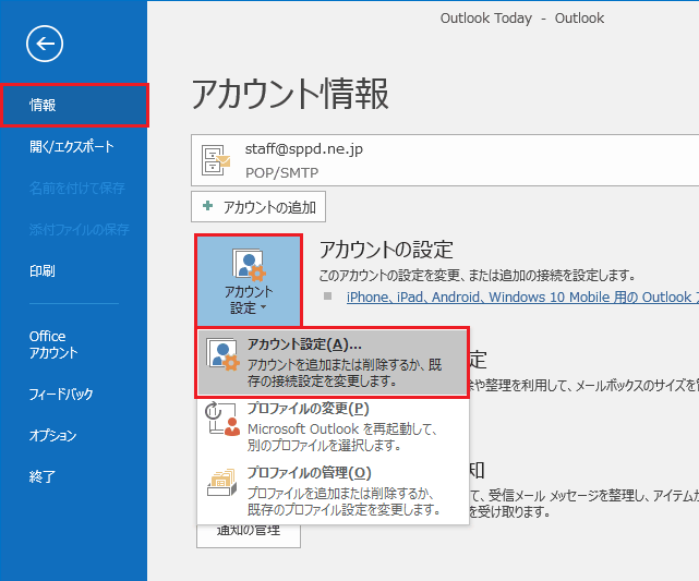 「情報」→「アカウント設定」をクリックすると下に選択項目が表示されますので、「アカウント設定(A)...」をクリックします。