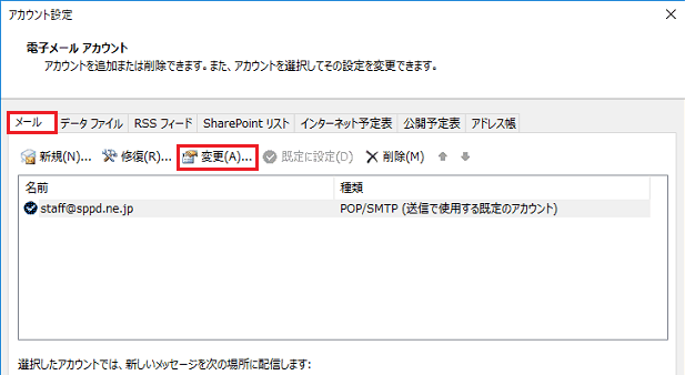 「アカウント設定」の画面が表示されたら、「電子メール」タブをクリックし、設定変更を行いたいアカウントを選択し、「変更」をクリックします。