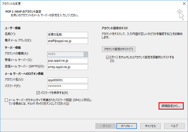 「POPとIMAPのアカウント設定」の画面が表示されたら、「詳細設定」ボタンをクリックします。