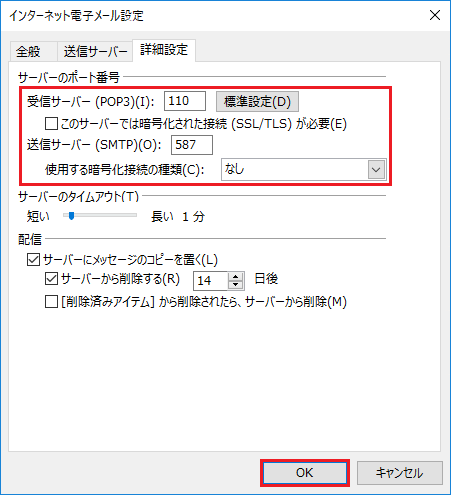 「詳細設定」のタブをクリック後、「受信サーバー(POP3)」を「995」→「110」に変更し、「このサーバーは暗号化された接続(SSL)が必要」のチェックを外します。また、「送信サーバー(SMTP)」を「465」→「587」に変更し、「使用する暗号化接続の種類」を「なし」に変更します。入力が終わりましたら「OK」をクリックします。