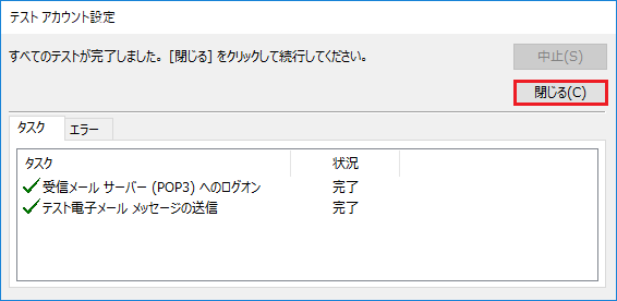 「テスト アカウントの設定」の画面が表示され、設定した内容でサーバーに接続できるかテストが行われます。「受信メールサーバー(POP3)へのログオン」と「テスト電子メールメッセージの送信」の状況が「完了」になりましたら、アカ ウントの設定が完了となります。