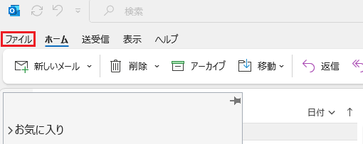 Outlook2021 を起動し、メニューから「ファイル」をクリックします。