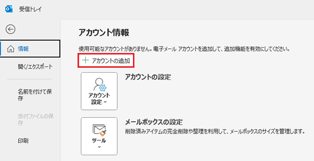 その後、左メニュー「情報」をクリックし、右側に表示されるアカント情報画面上の「アカウントの追加」をクリックします。