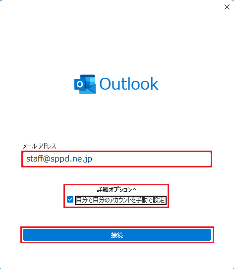 設定するメールアドレスを入力します。その後、「詳細オプション」をクリックし、「自分で自分のアカウントを手動で設定」にチェックを入れ、「接続」をクリックします。