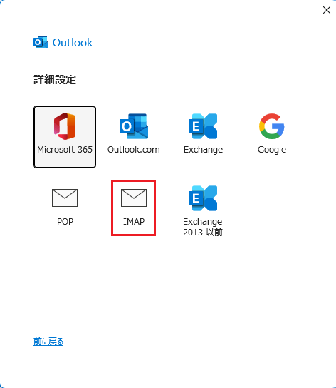 アカウントの種類を選択する画面が表示されるので、「IMAP」をクリックします。