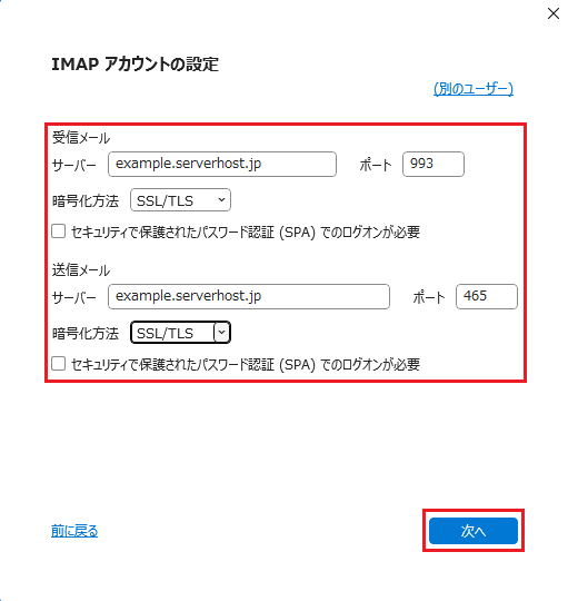 (送信:SMTP over SSL / 受信:IMAP over SSL)