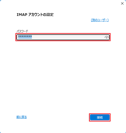 なお、Outlook側の仕様により、正しいパスワードを入力していたとしても、この後の画面で「IMAPサーバーへの接続ができません。」等のエラーが発生し、正常に設定を進めることができない場合があります。この場合は別の手順で設定を行う必要がありますので、Outlook 2021 コントロールパネルからのメールソフトの設定(IMAP)の手順で設定を行ってください。