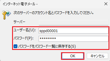 再度ユーザー名とパスワードの入力画面が表示されますので、「ユーザー名」に今回設定するメールアドレスに紐づいているユーザー名を入力し、「OK」をクリックします。