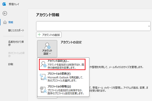 「情報」→「アカウント設定」をクリックすると下に選択項目が表示されますので、「アカウント設定(A)...」をクリックします。