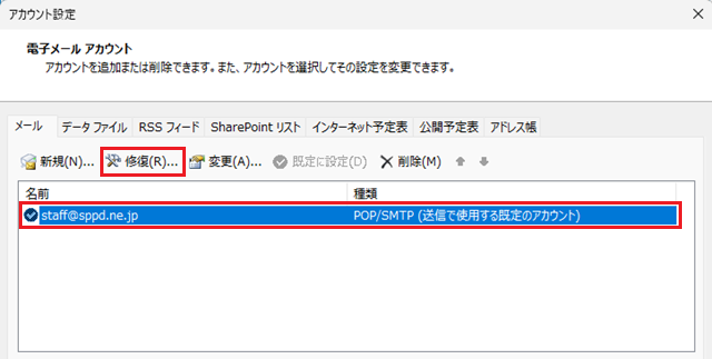 「アカウント設定」の画面が表示されましたら、設定変更を行うアカウントを選択し、「修復」をクリックします。