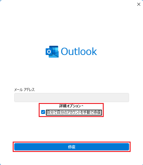 以下の画面が表示されたら、詳細オプション内の「自分で自分のアカウントを手動で修復」にチェックを入れ、「修復」をクリックします。