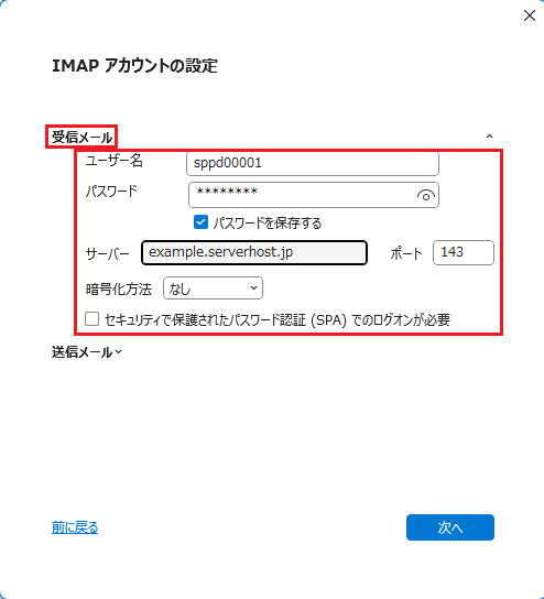 「IMAPアカウントの設定」画面になりますので、まずは「受信メール」をクリックし、以下を参考に各情報を入力してください。