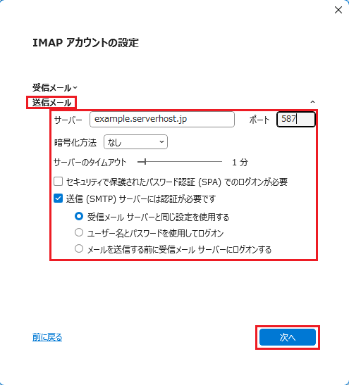 - 送信(SMTP)サーバーには認証が必要です:チェックを入れる