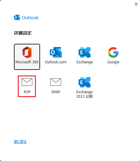アカウントの種類を選択する画面が表示されるので、「POP」をクリックします。