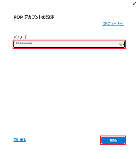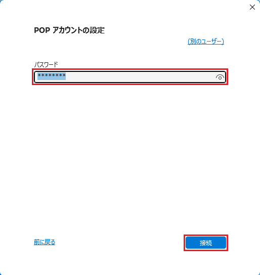 再度パスワード入力の画面が表示されますので、パスワードを入力し「接続」をクリックします。