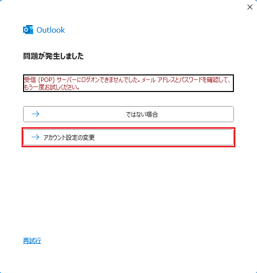 その後、エラー画面が表示されますので「アカウント設定の変更」をクリックします。