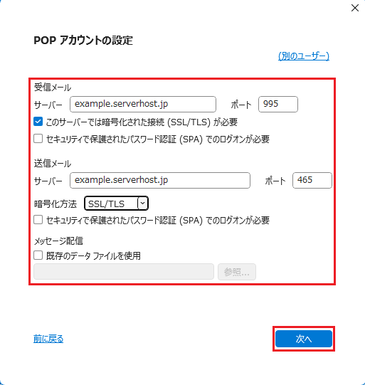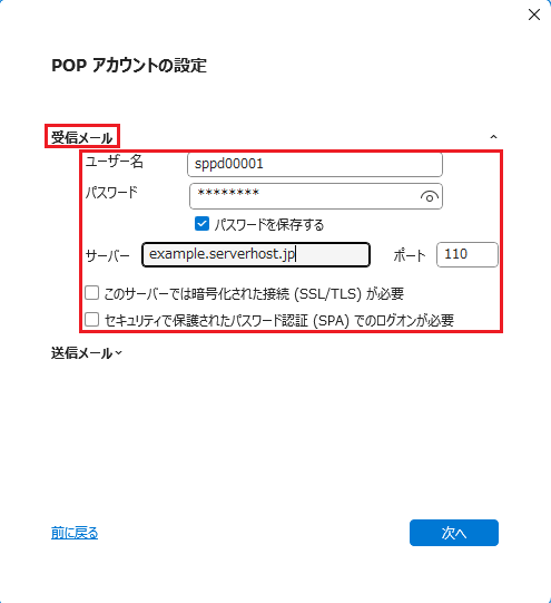 「POPアカウントの設定」画面が表示されますので、レンタルサーバー登録通知書を参考に下記のように入力し、「次へ」をクリックします。