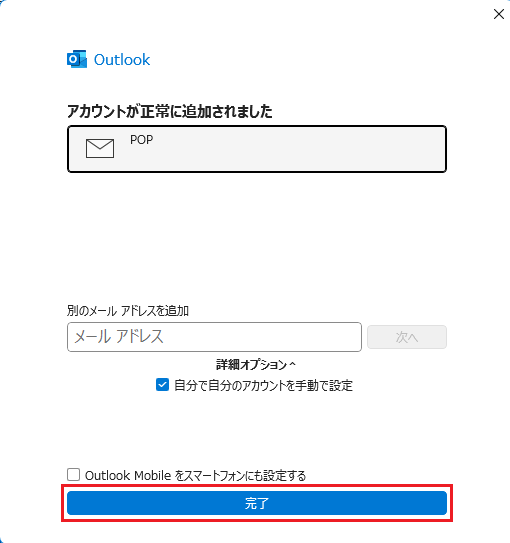 設定内容に問題が無ければアカウントの修復が行われますので、「完了」をクリックして設定完了となります。