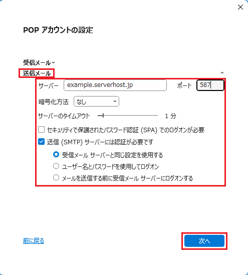 - 送信(SMTP)サーバーには認証が必要です:チェックを入れる