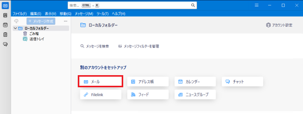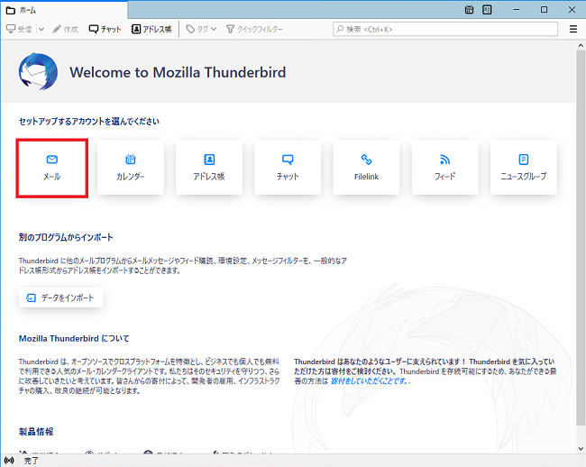 Thunderbird 115 を起動し、トップ画面に表示されている「メール」をクリックします。