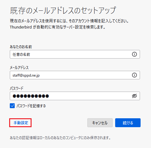「既存のメールアドレスのセットアップ」の画面が表示されますので、任意の名前、ご利用になるメールアドレス、パスワードを入力し、「手動設定」をクリックします。