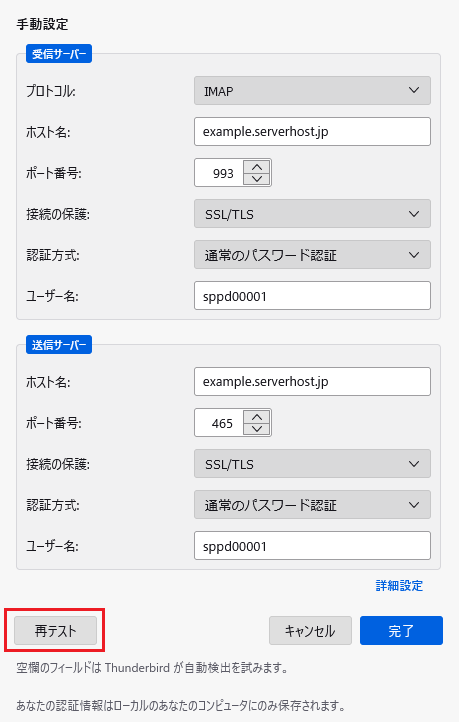※ 【代理店制度で、CentOS 7系以前のサーバーをご利用のお客様】Thunderbird 115はSSL接続に使用するためのサーバー側の証明書が対応していない形式のため、「IMAP over SSL」「SMTP over SSL」の設定が出来ない場合があります。ただし、専用サーバーとマネージドVPSをご利用のお客様については回避が可能な場合がありますので、サポート窓口までお問い合わせください。