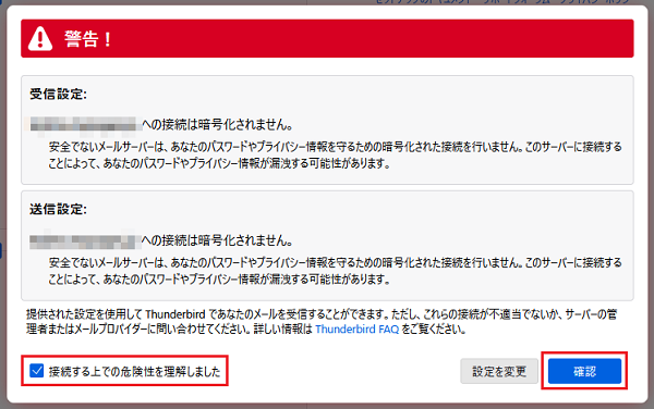 「~への接続は暗号化されません」という内容の警告が表示されるので、「接続する上での危険性を理解しました」にチェックを入れ、「確認」をクリックすることで設定は完了です。セキュリティを強化する場合は、IMAP over SSL、SMTP over SSLの設定を行って下さい。